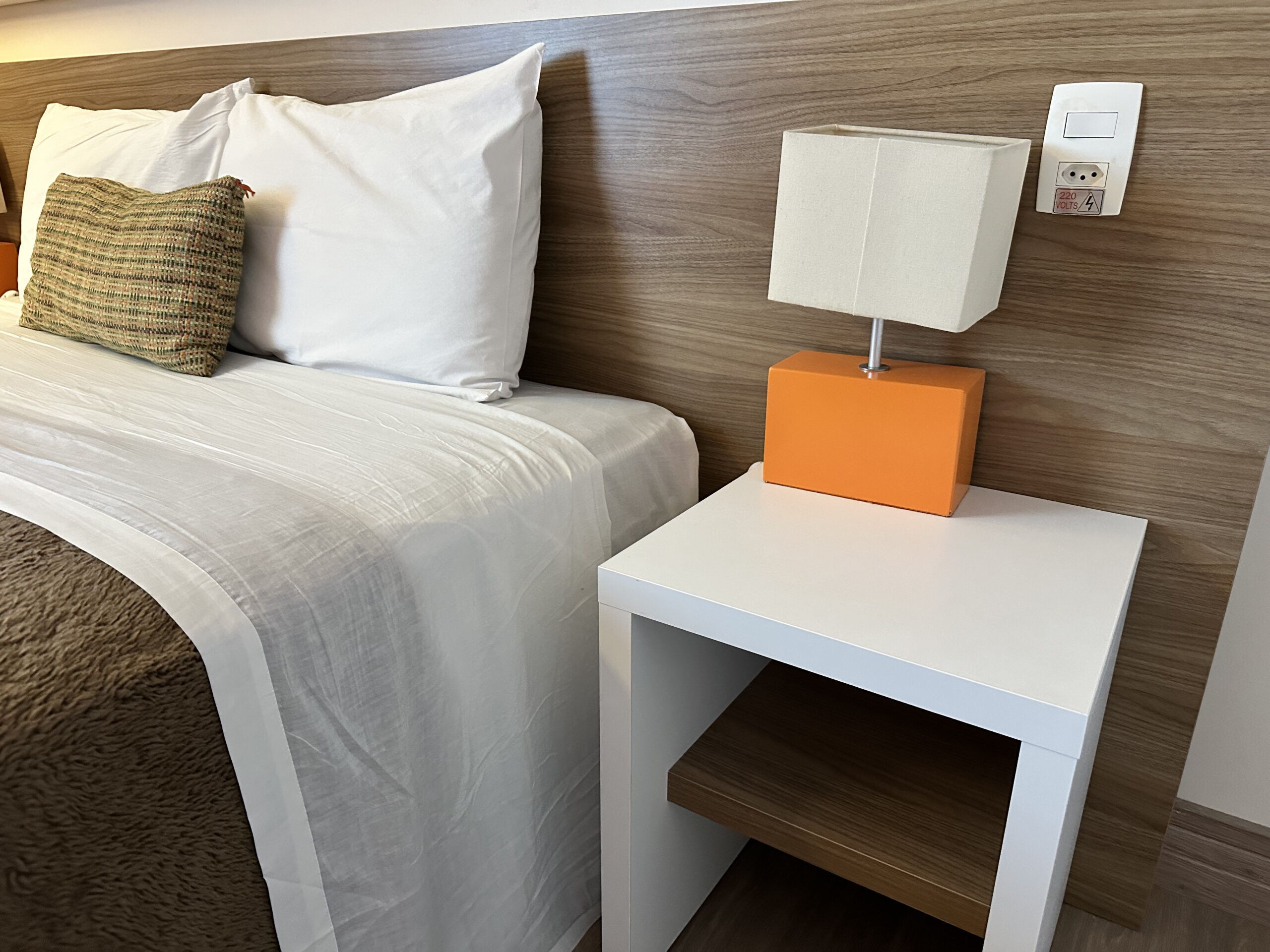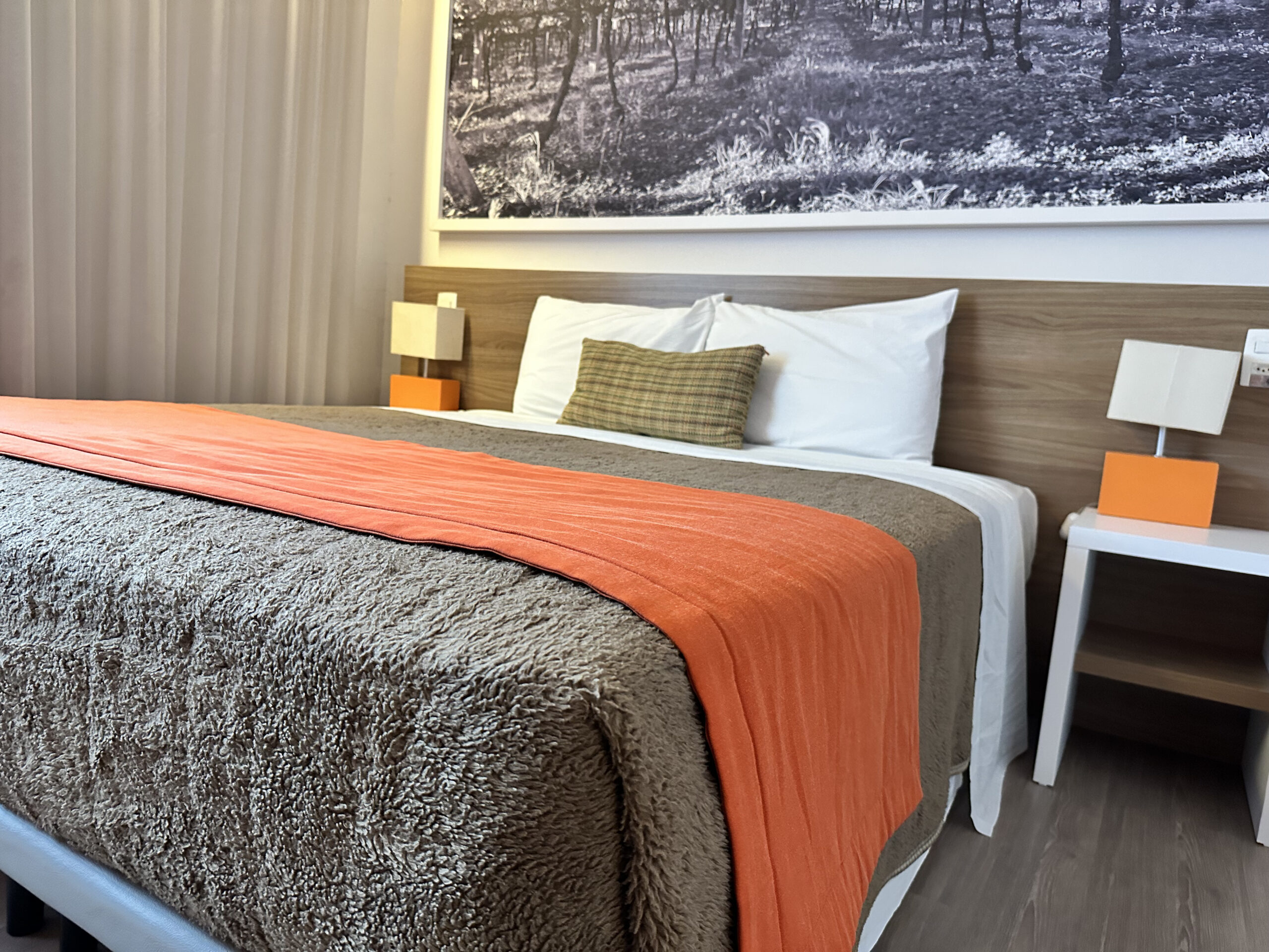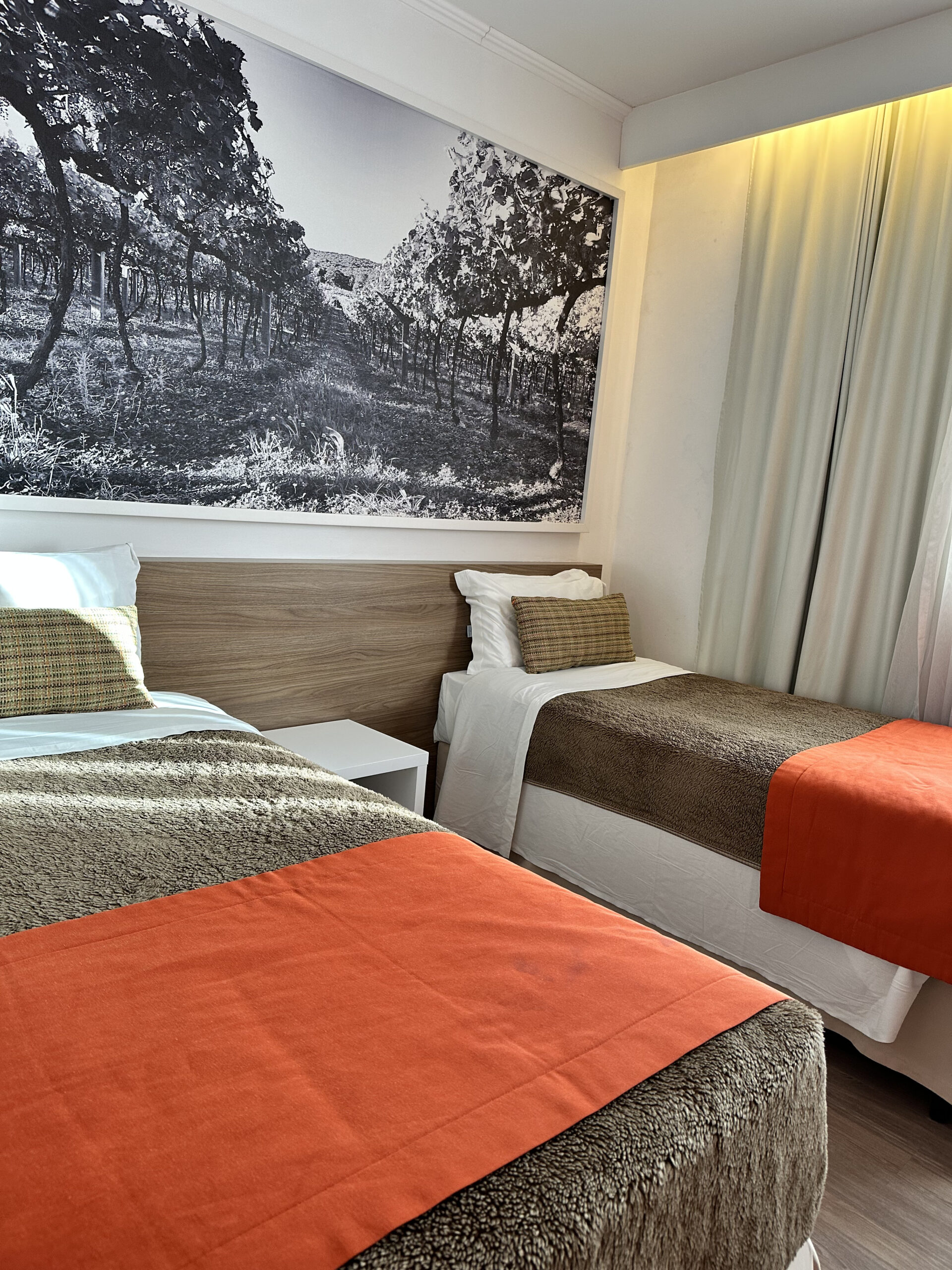 Acomodações confortáveis com cama de casal ou duas de solteiro, roupa de cama macia e ambiente climatizado. Possui TV, Wi-Fi gratuito, frigobar e mesa de trabalho. O banheiro privativo conta com chuveiro, toalhas e itens básicos de higiene. Ideal para quem busca praticidade e tranquilidade durante a estadia.